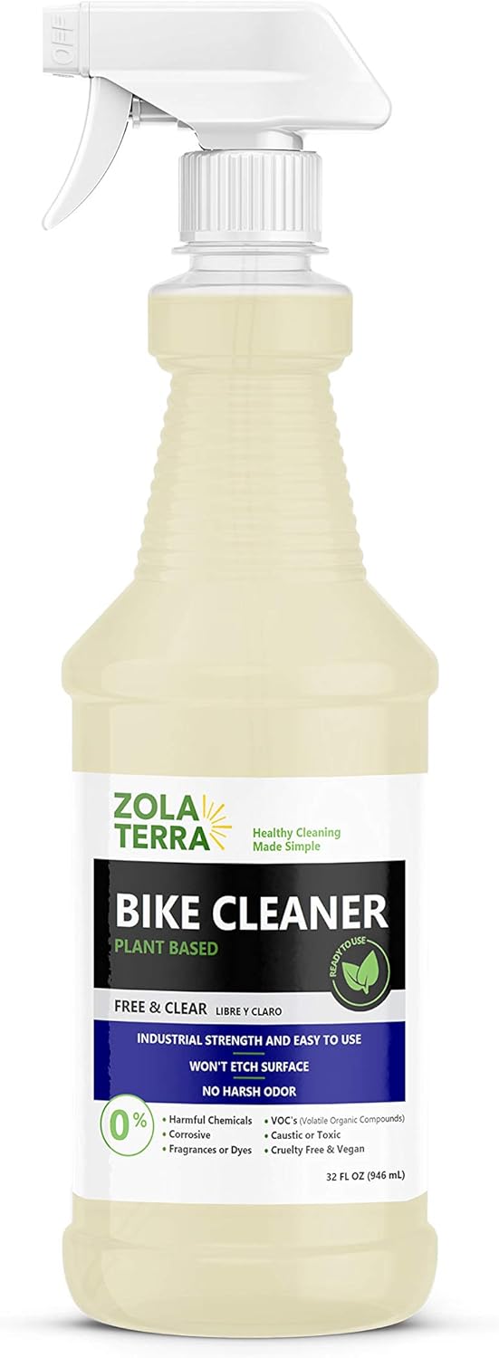 ZolaTerra Bike Cleaner is a ready-to-use cleaner that works best when applied at full strength. For use on all bike surfaces like steel, aluminum, carbon fiber, chrome, titanium, plastic, rubber and the drive train. Cleans in one application without any odor, gloves, or special handling. ZolaTerra products are certified by NSF, Leaping Bunny, PETA Cruelty Free and Vegan and by the USDA as a Bio Preferred Plant Based Product.
